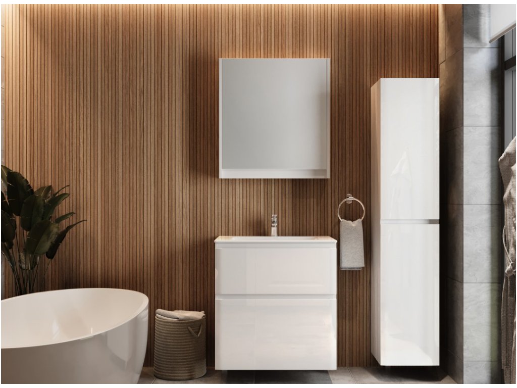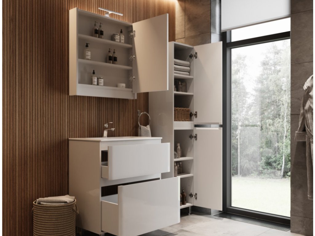 Rám skrinky je vyrobený z drevotrieskovej dosky s hrúbkou 16 mm a predné časti skrinky sú vyrobené z MDF s hrúbkou 19 mm. Z vonkajšej strany je povrch kúpeľňovej skrinky upravený lesklým bielym smaltom. Okrem toho sú predné časti skrinky po stranách prakticky a dizajnovo zaoblené. Nie sú tu žiadne úchyty, ich funkciu plní špeciálne frézovanie na čelách zásuviek.