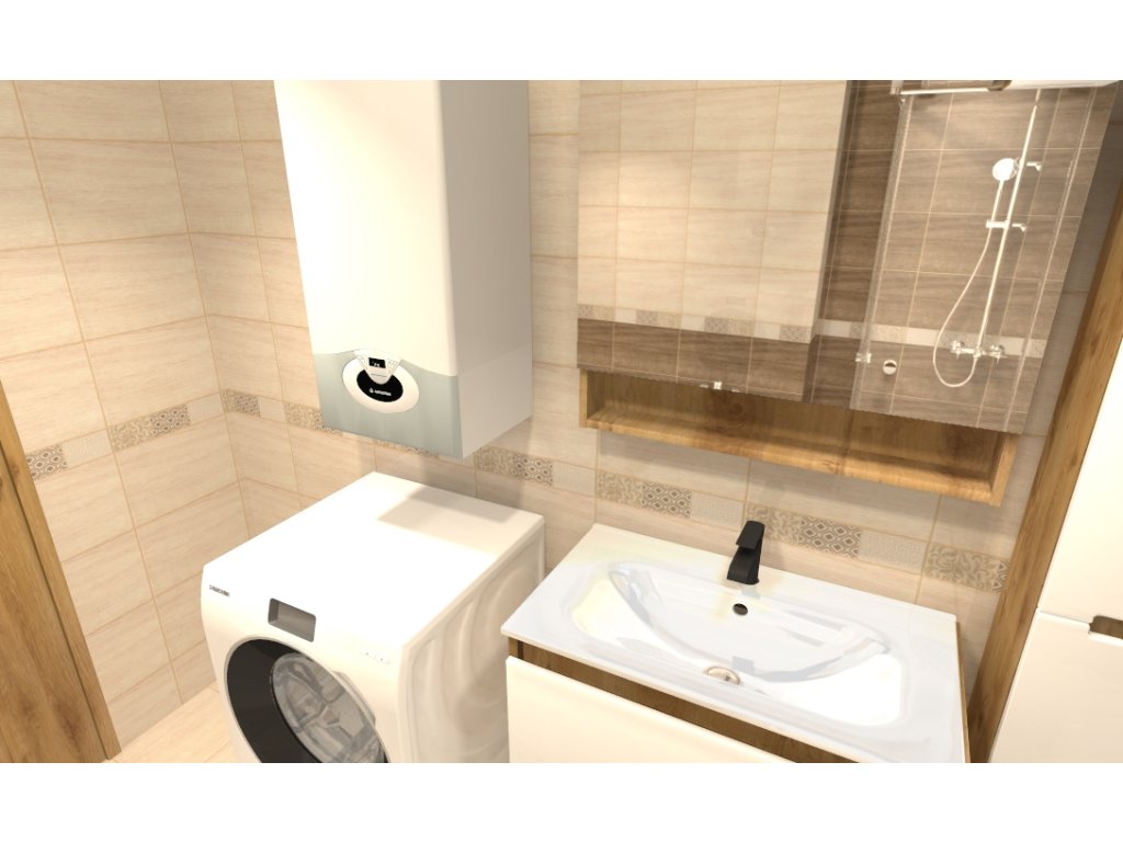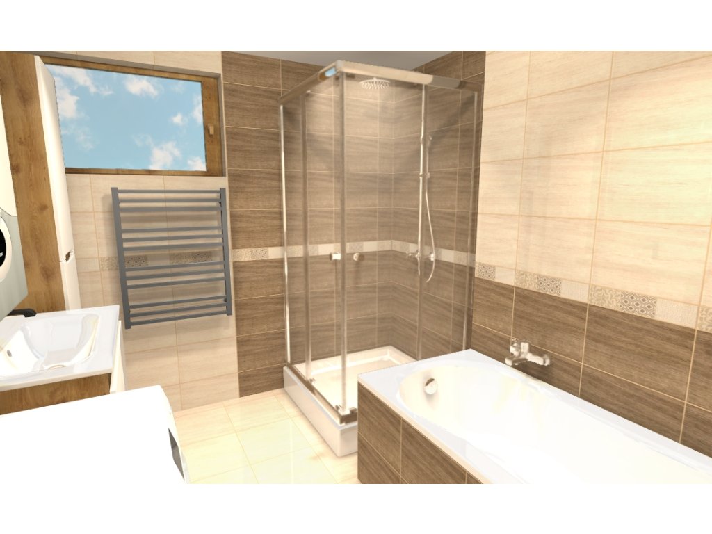 Vizualizácia tejto kúpeľne bola vykonaná podľa presných pokynov zákazníka. Kúpeľňa je vybavená akrylátovou vaňou, sprchovacím kútom a krásnym nábytkom.