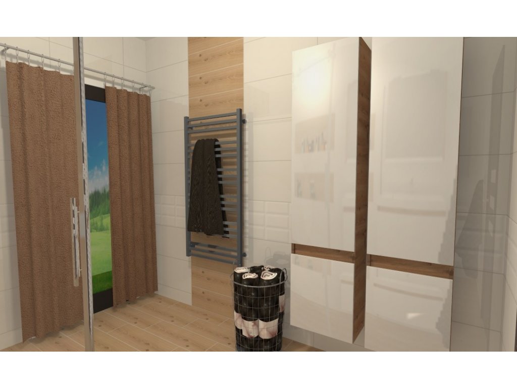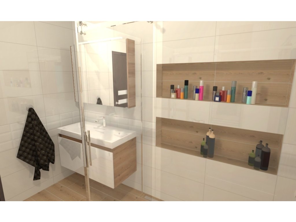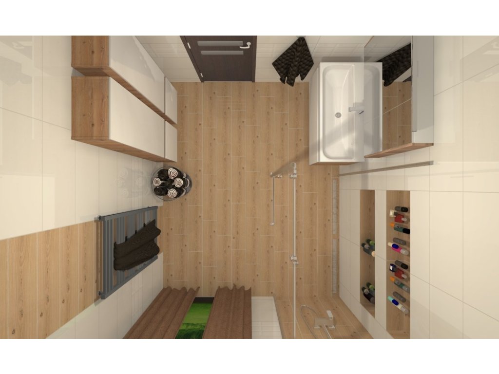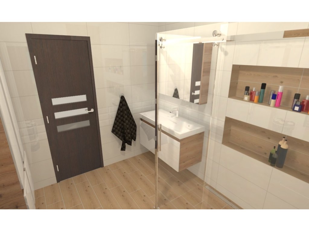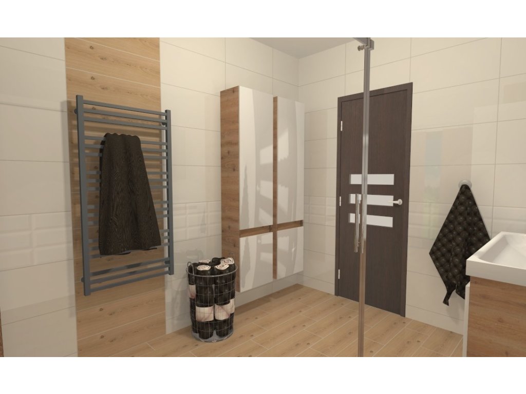 Čo sa týka kúpeľňového obloženia, je naozaj veľmi decentné, vkusné a nadčasové, takže zákazníka určite neomrzí ani po niekoľkých rokoch. Kúpeľňa je obložená sériou Naris, ktorá kombinuje vkusný dekor dreva s bielymi lesklými obkladačkami vo formáte 60x30 a reliéfnym dekorom "buchiet".
