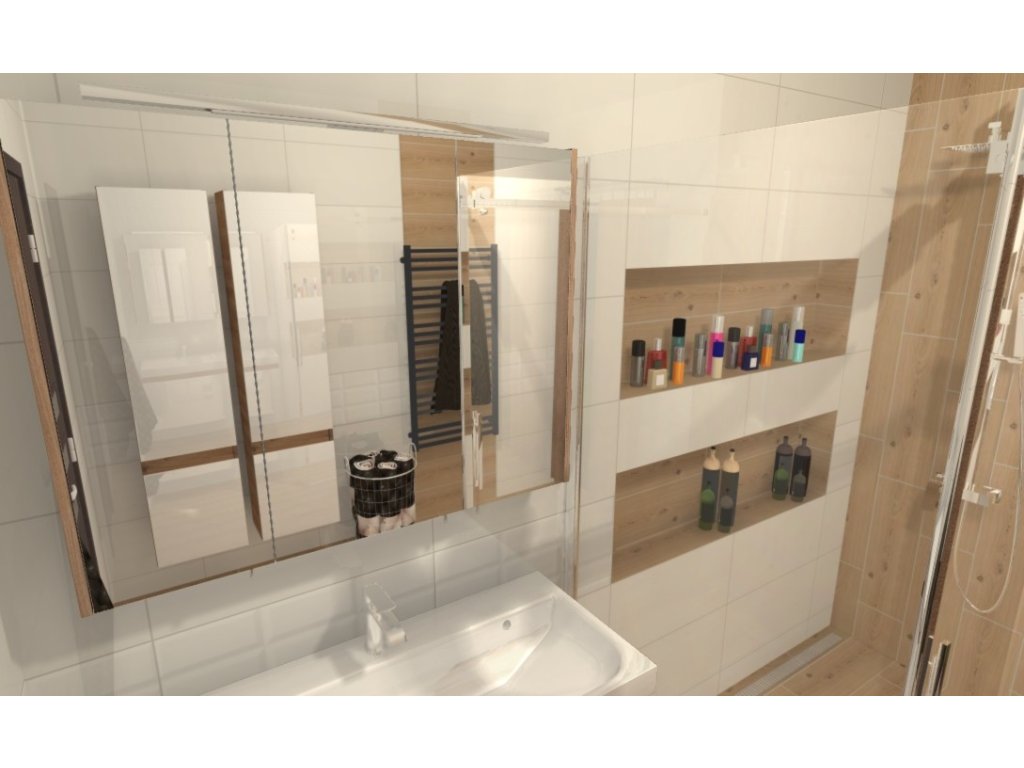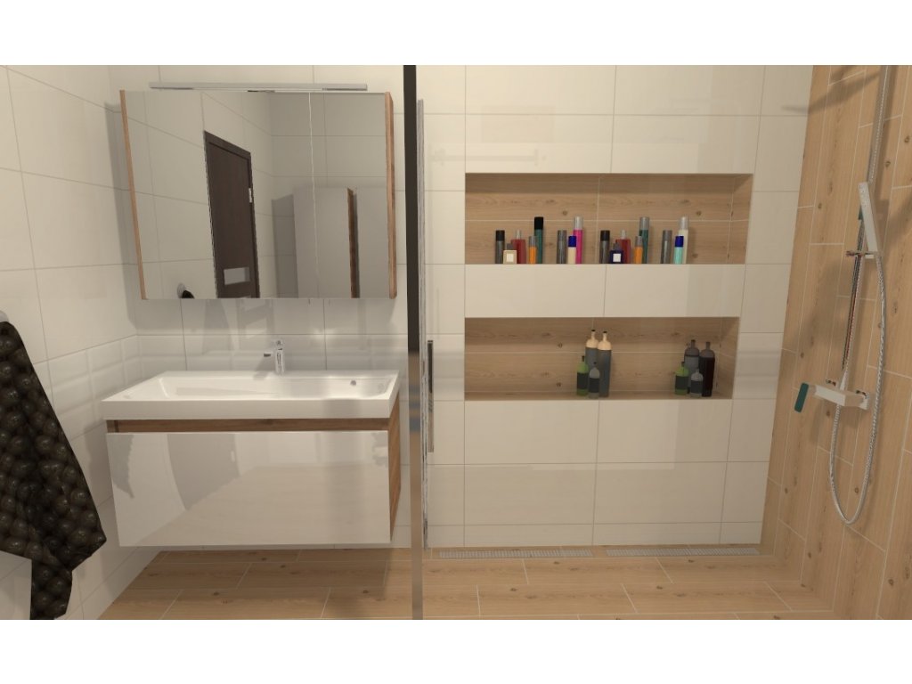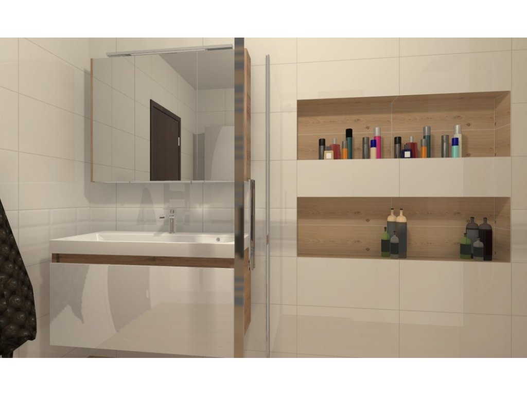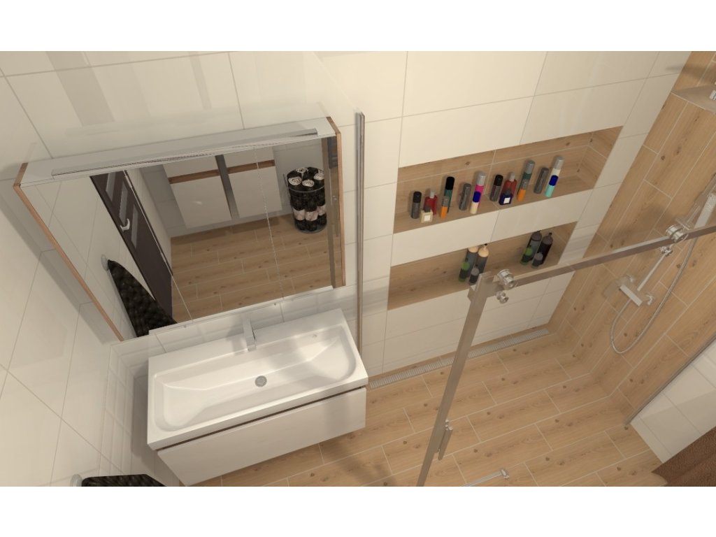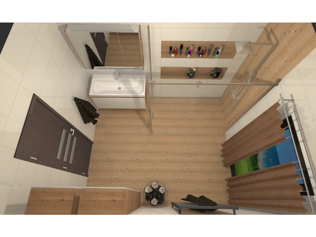 Čo sa týka kúpeľňového obloženia, je naozaj veľmi decentné, vkusné a nadčasové, takže zákazníka určite neomrzí ani po niekoľkých rokoch. Kúpeľňa je obložená sériou Naris, ktorá kombinuje vkusný dekor dreva s bielymi lesklými obkladačkami vo formáte 60x30 a reliéfnym dekorom "buchiet".