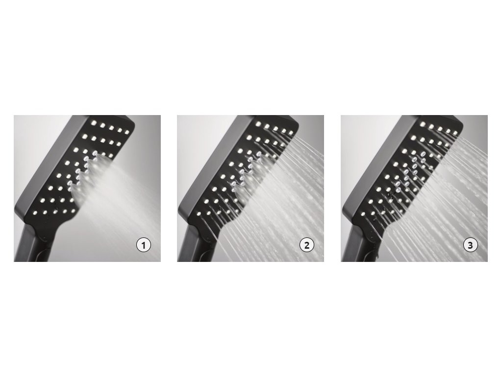 Ručná sprcha obsahuje 3 možné funkcie - klasickú, zmiešanú a dažďovú -, ktoré možno meniť pomocou pohodlného tlačidla.