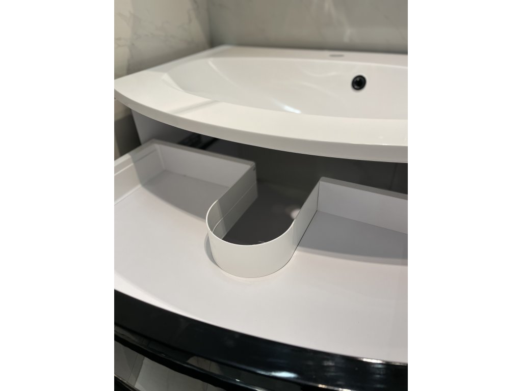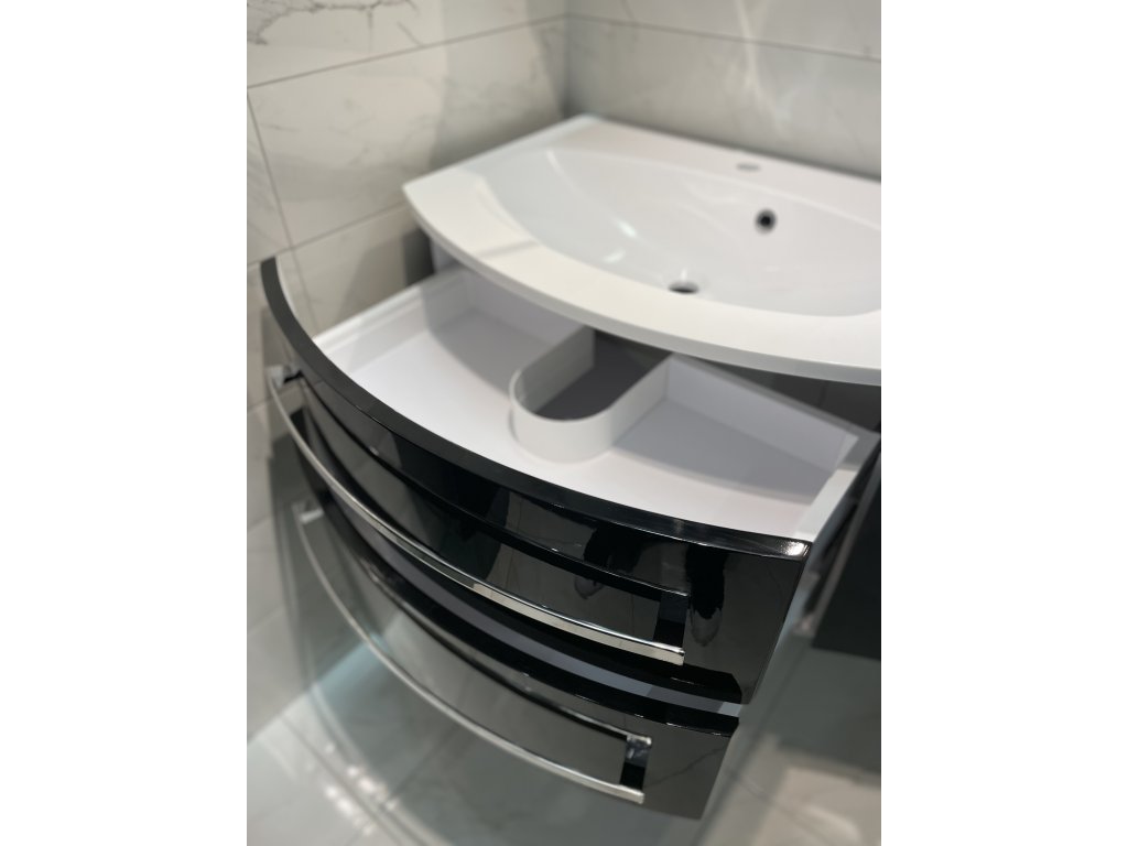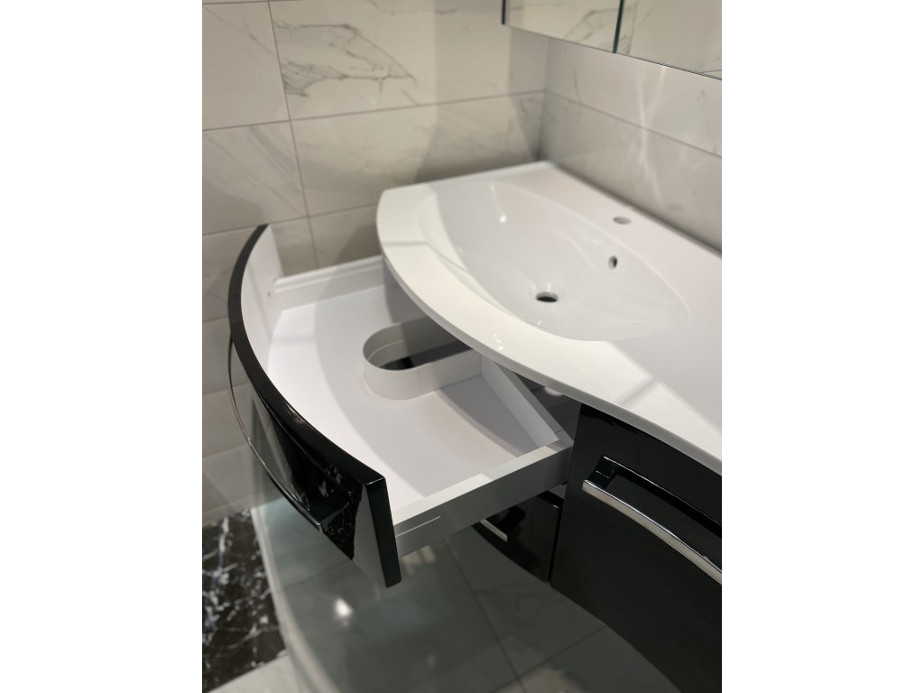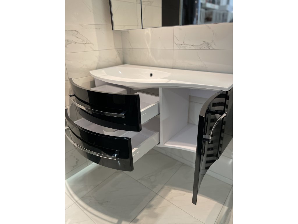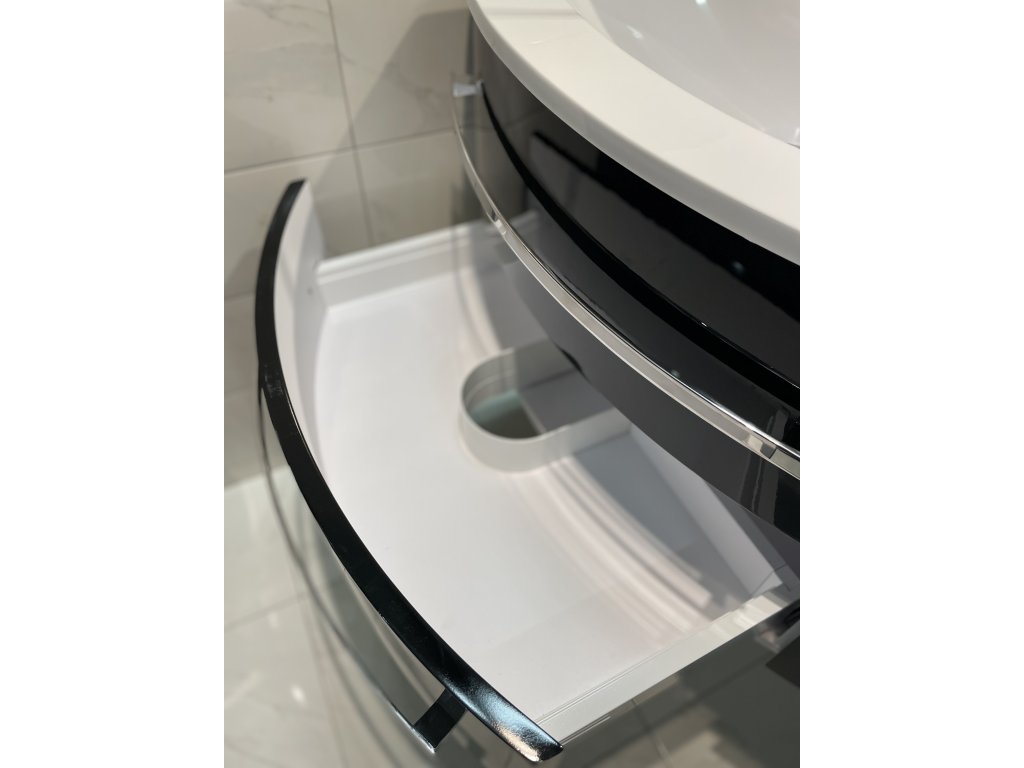 Predstavujeme úplne nový luxusný kúpeľňový nábytok, ktorý poteší každého. Táto absolútne dizajnová skrinka s umývadlom by rozhodne nemala chýbať v žiadnej modernej kúpeľni. Bočnice skrinky sú vyrobené z 16 mm MDF dosky. Predná časť skrinky je vyrobená z 18 mm MDF. Umývadlo, ktoré je súčasťou skrinky, je vyrobené z liateho mramoru. Povrchová úprava je čierna farba potiahnutá transparentným lakom. Úchyty skrinky sú vyrobené z nehrdzavejúcej ocele. Skrinka je určená na zavesenie na stenu, čo zaručuje bezproblémové čistenie. Veľkou výhodou tejto skrinky je jej jemné zatváranie, vďaka ktorému je používanie skrinky absolútne pohodlné. Pocíťte výhody a úložný priestor, ktorý vám táto skrinka poskytuje.