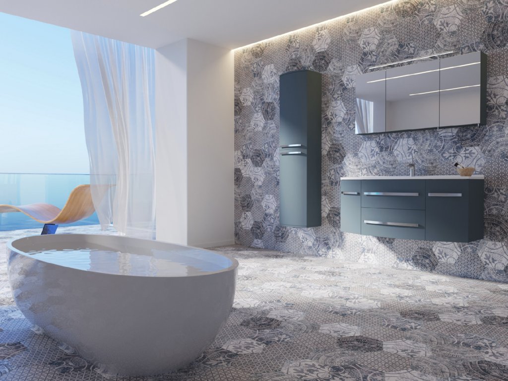 - dizajnová skrinka s umývadlom v matnej modrej farbe